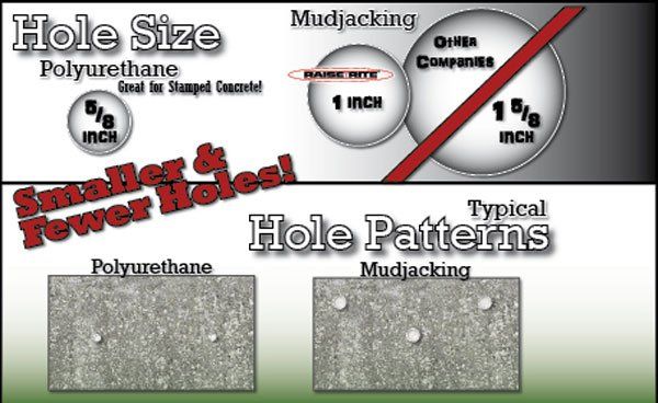 Polyurethane concrete raising drills a nearly invisible 5/8" hole and the process calls for considerably fewer holes than traditional mudjacking.